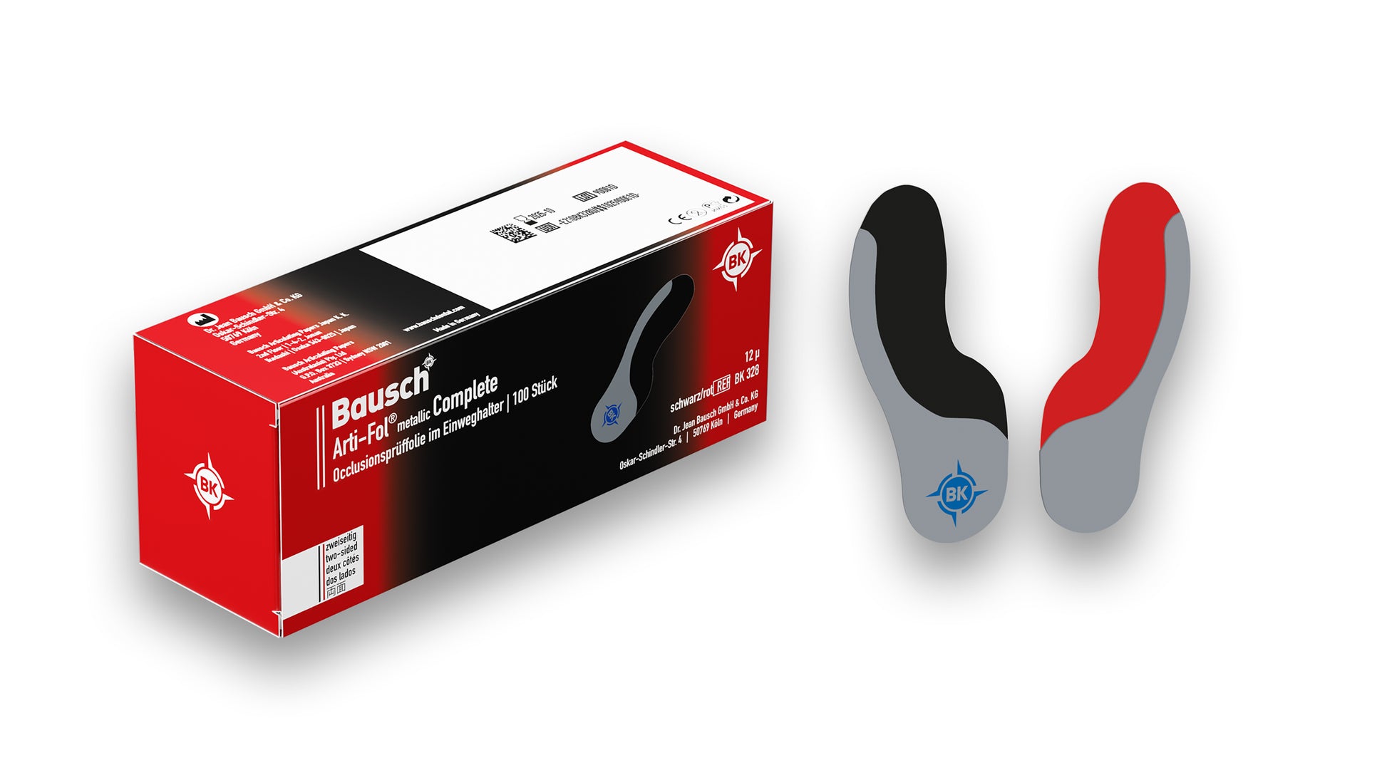 The unique combination of a high-tech metal foil (Shimstock foil 12μ) and a two-sided color coating with micro-fine ground color pigments enables clear visible marking of all occlusal contact points. Arti-Fol® metallic BK 28 also precisely marks moist occlusal surfaces. It is thus universally applicable for all materials such as metal, ceramics and plastics, including composites and natural teeth.