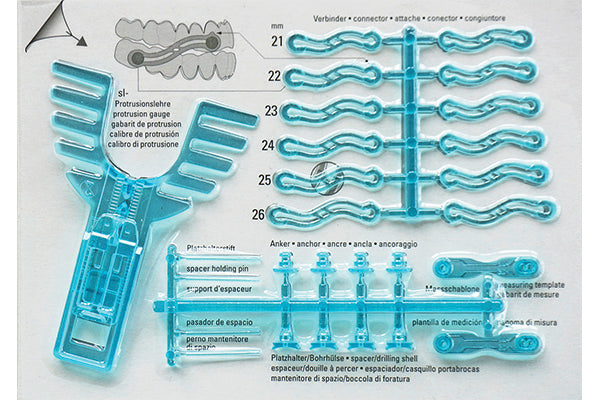 Card with connectors, spacer/holding pin, drilling shell, is-protrusion gauge, measuring templates, spacer and anchor.